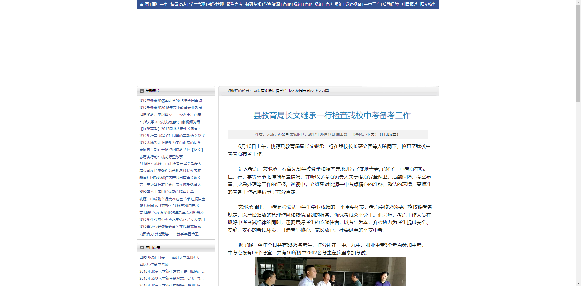6月16日上午,桃源县教育局局长文继承一行在我校校长燕立国等人陪同下,检查了我校中考考点布置工作。
