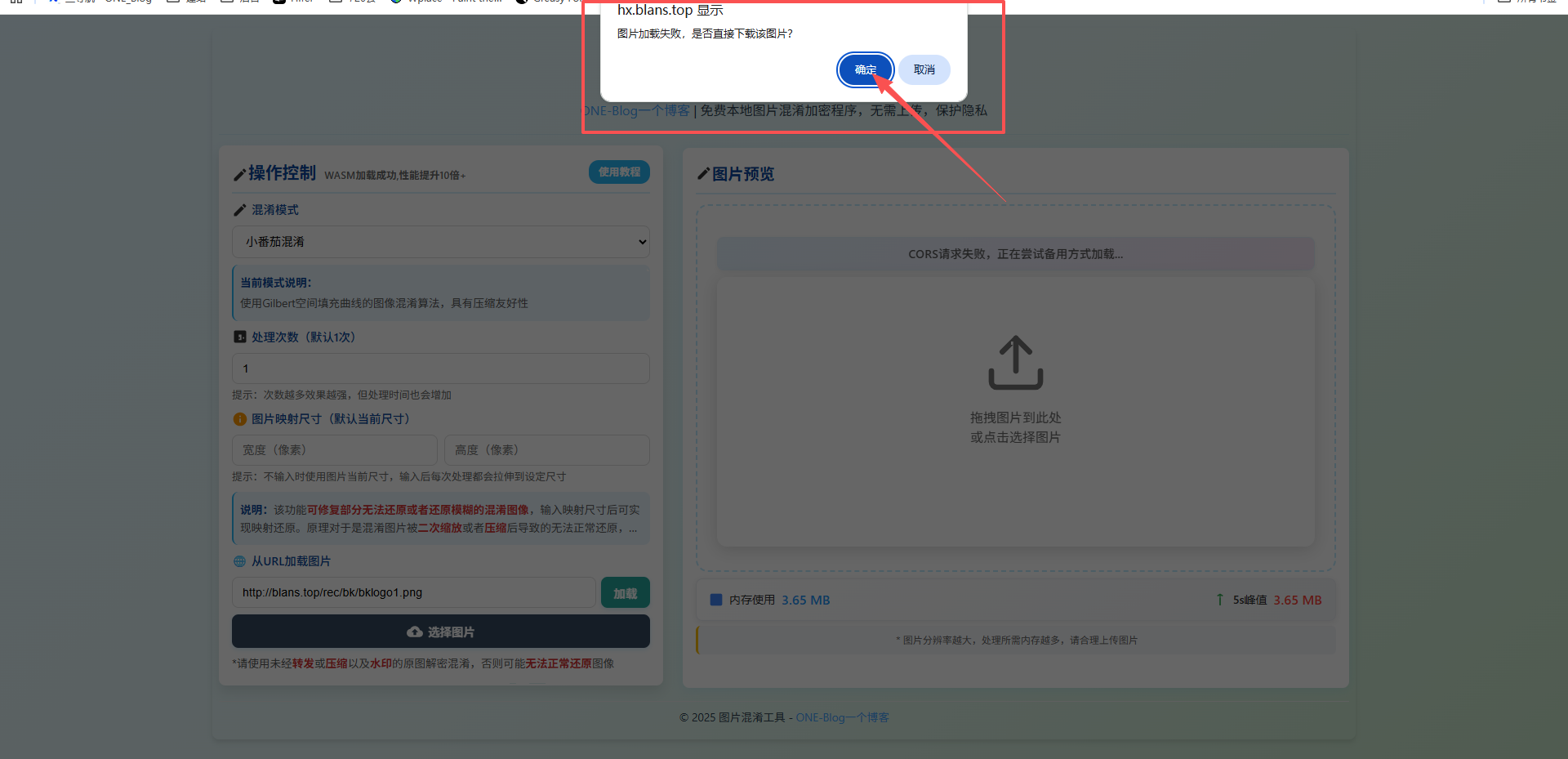 「加载」 按钮,等待图片加载完成 - 加载失败也可自动唤起手动下载方式,下载后再上传