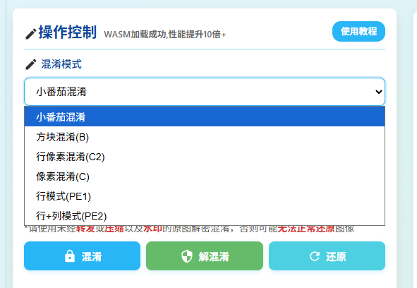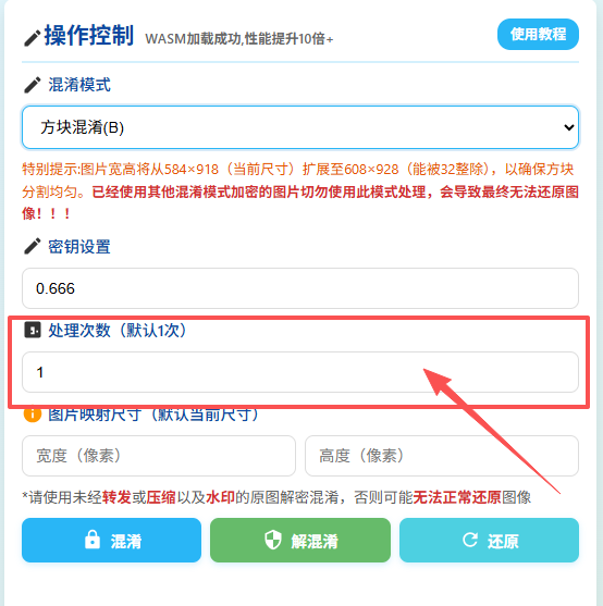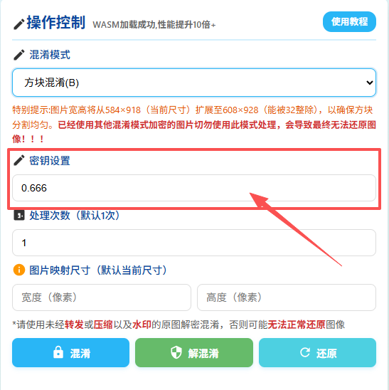 特别注意:选择方块混淆(B)模式时,若图片宽高不能被32整除,将自动扩展至能被32整除的尺寸。已经使用其他混淆模式加密的图片切勿使用此模式处理,否则可能导致无法还原图像。