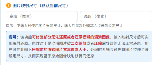 在此输入压缩前的原始图片宽高像素大小 - 系统会预先将图片拉伸至设定尺寸,从而实现基于原始图像映射修复还原