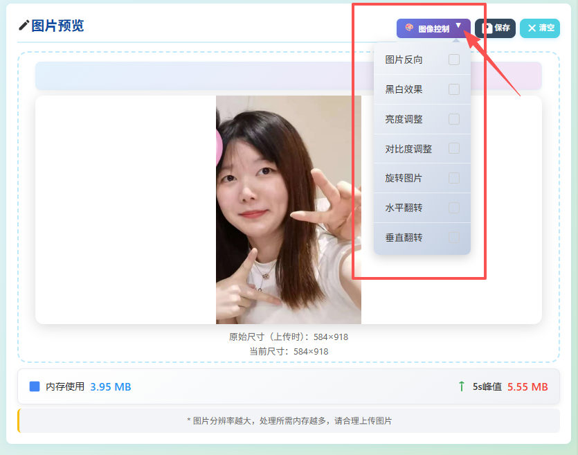 点击「图像控制」按钮可以使用以下图片滤镜功能: